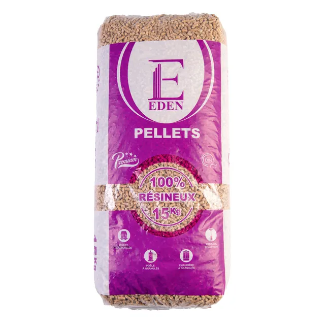 De EDEN PELLETS PREMIUM houtpellets worden geleverd in zakken van 15 kg en zijn beschikbaar op pallets van 66 zakken, voor een betrouwbare, economische en milieuvriendelijke verwarmingsoplossing.
