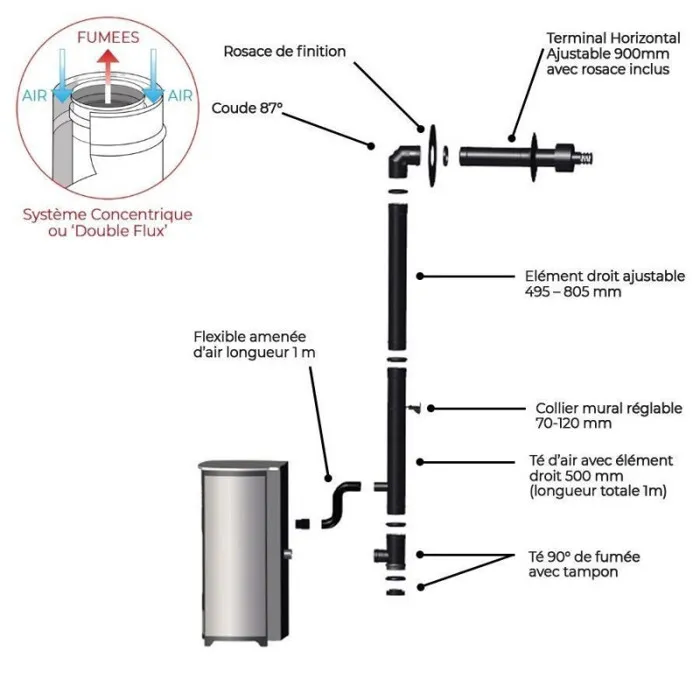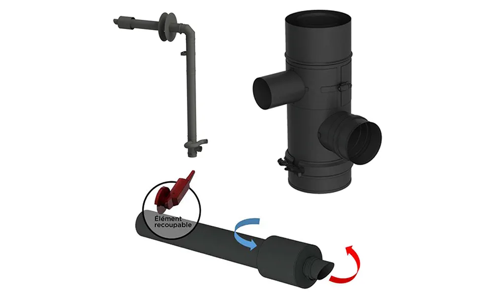 De pack bevat ook een Horizontale ventilatiekit INTERSTOVES, gecertificeerd door DTA CSTB 14/10-1582, wat een economische installatie mogelijk maakt zonder dure dakdoorvoeringen. Deze kit is ontworpen voor eenvoudige en snelle installatie met concentrische dubbele luchtstromen, en biedt meerdere voordelen: